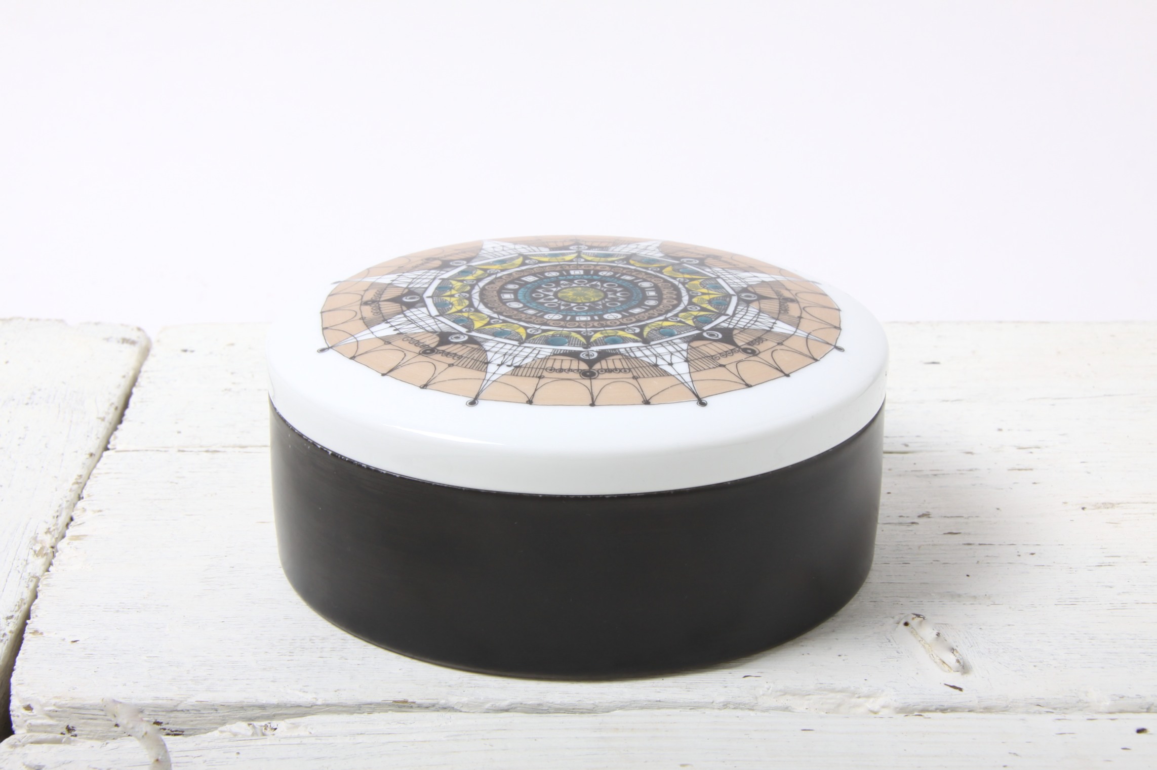 A fantastic design, a shallow bowl / plate with a sloping sides and a rough ovoid shape. With a very graphic decor ‘Venezia’ that is so reminiscent of the 1950’s era. A glossy black base is hand decorated with deep incised lines and filled in with vivid glossy colours in red, yellow and turquoise, geometric, abstract and reflecting trends in Modern art and design in the 1950’s. The underneath is also glossily glazed in turquoise blue.