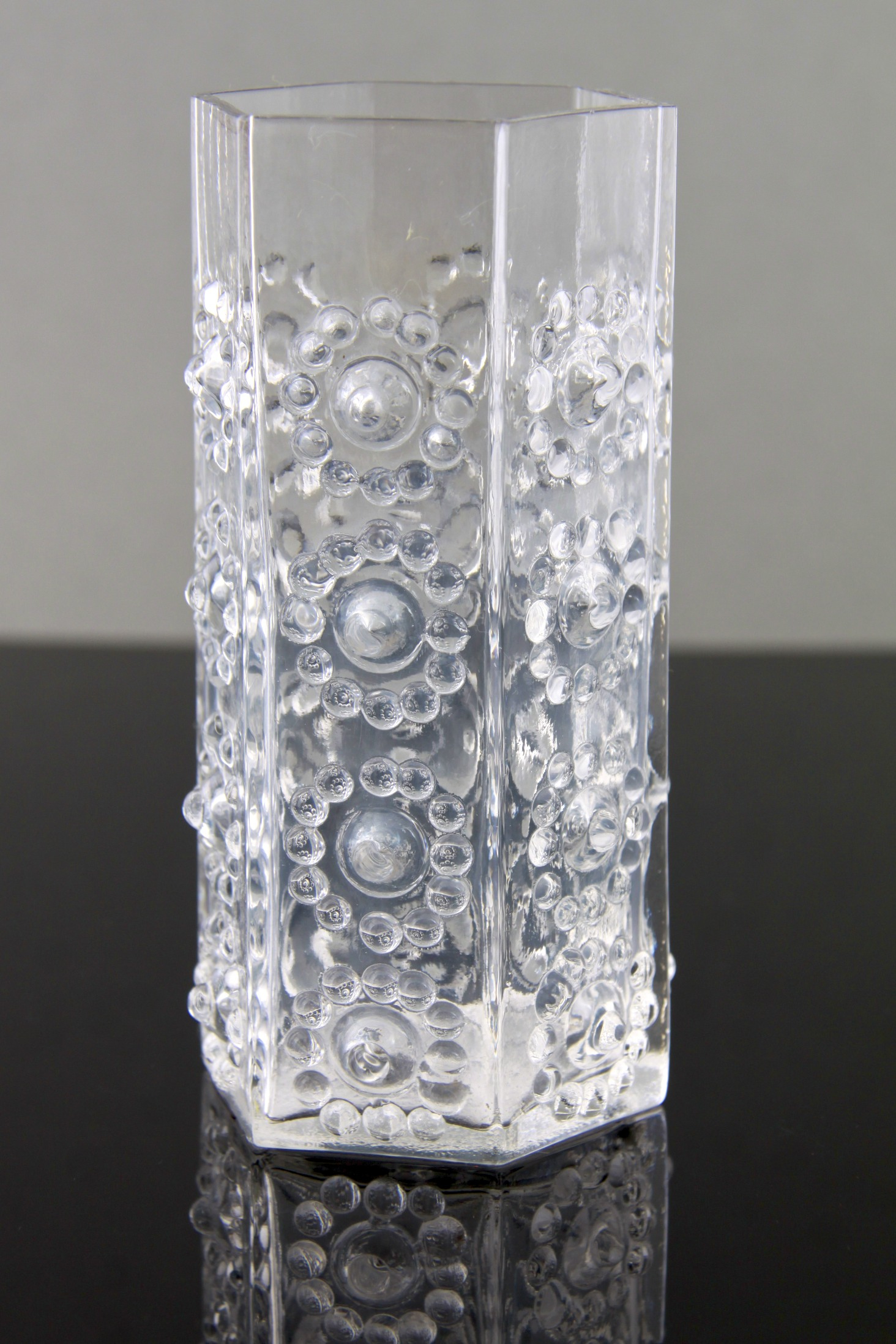 Fantastic Modernist design by Frank Thrower, hexagonal thick walled art glass, with raised ‘Panel + Spot’ motifs on each side, referencing ancient Greek styles.