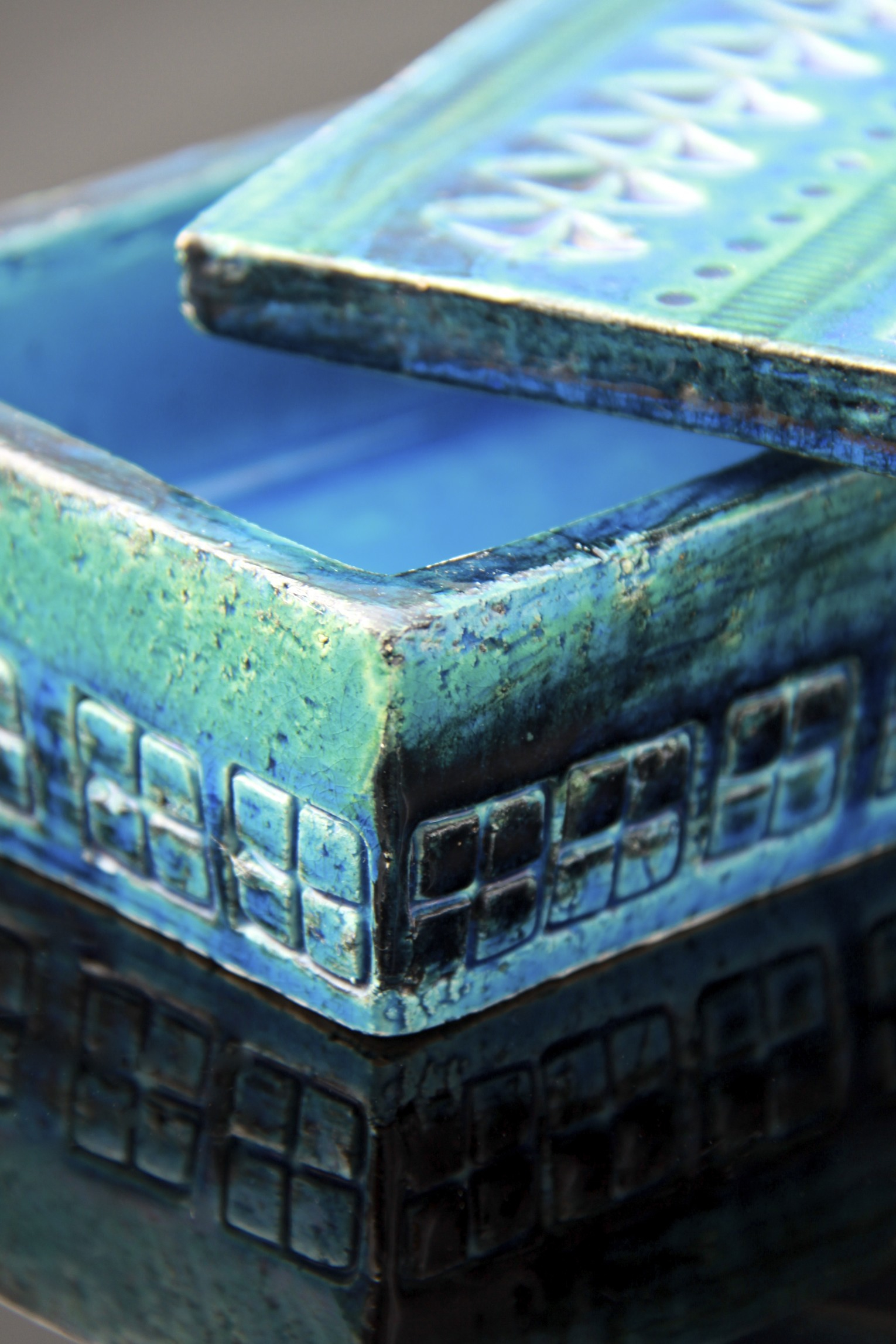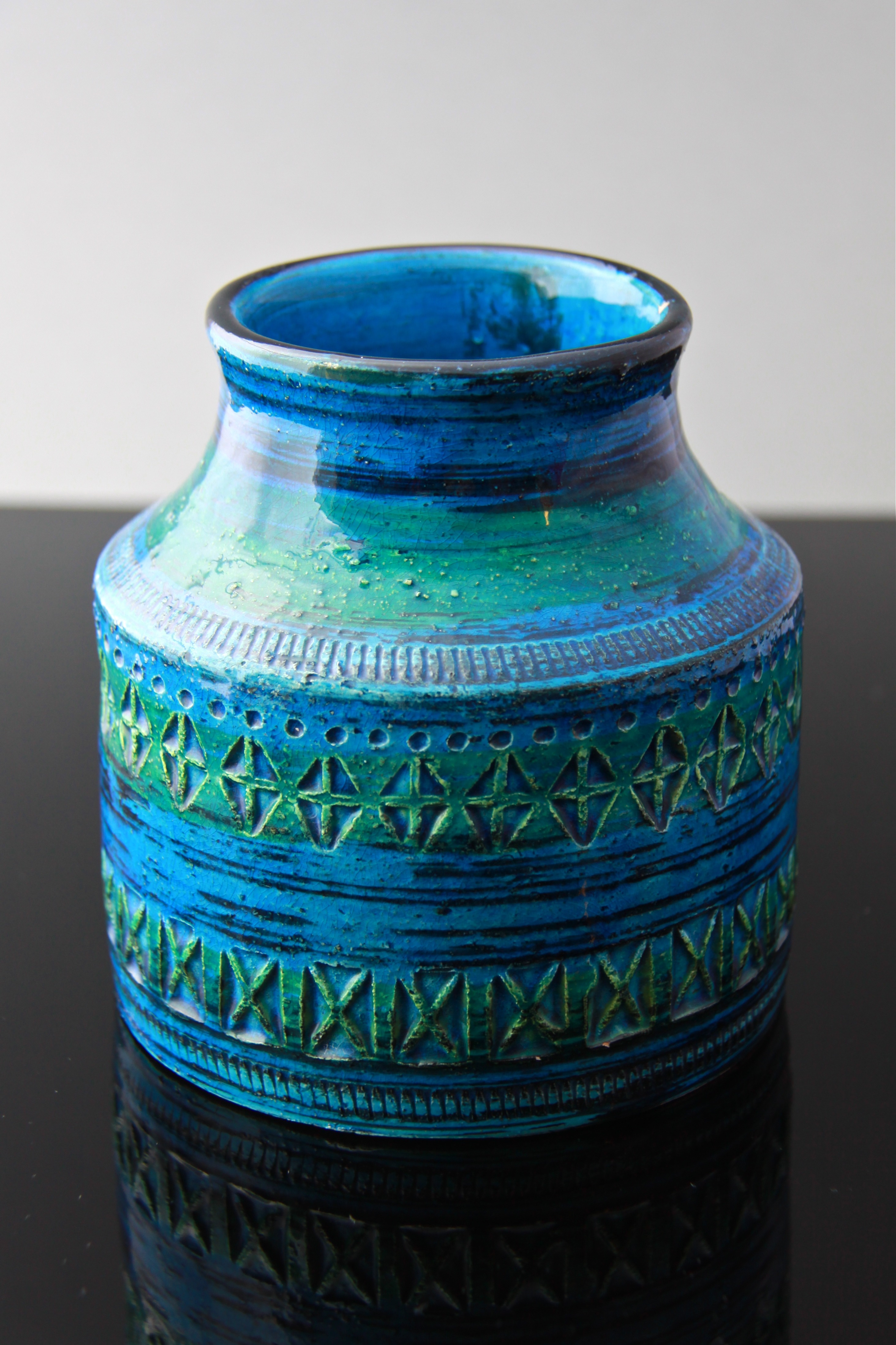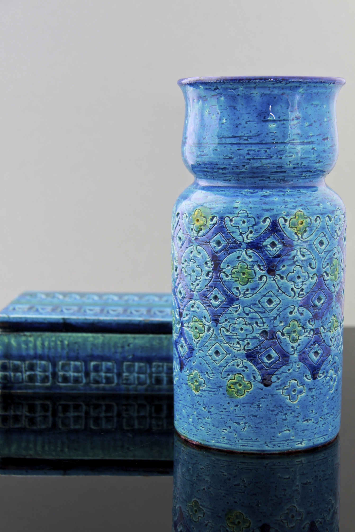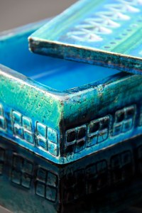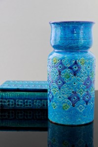 These two pieces illustrate how Italian potteries were leading the way with innovative mid-century modern ceramic design. From the San Marino’s trademark foamy white smalto roccia (rock glaze) that predated West German ‘Fat Lava’ styles, combined here with a highly stylised fashionable sgraffito image, evoking the 1960’s Italian glamour sought out by the new influx of foreign tourists. The Fratelli Fanciullacci jug with its heavily textured glaze and hand painted stripes is inspired by the resurgence in studio pottery in Italy at the time, and was important in the revival of craft and the growth of ‘Made in Italy’ after the war.