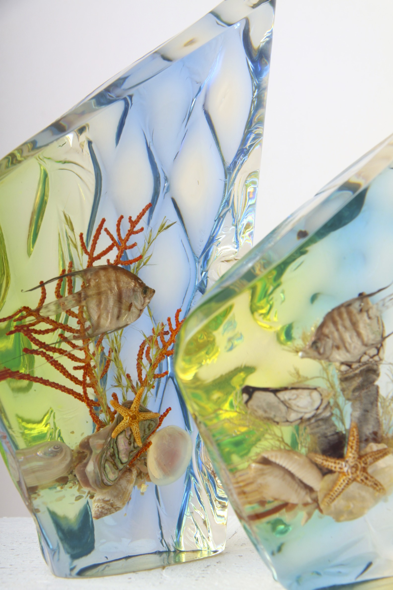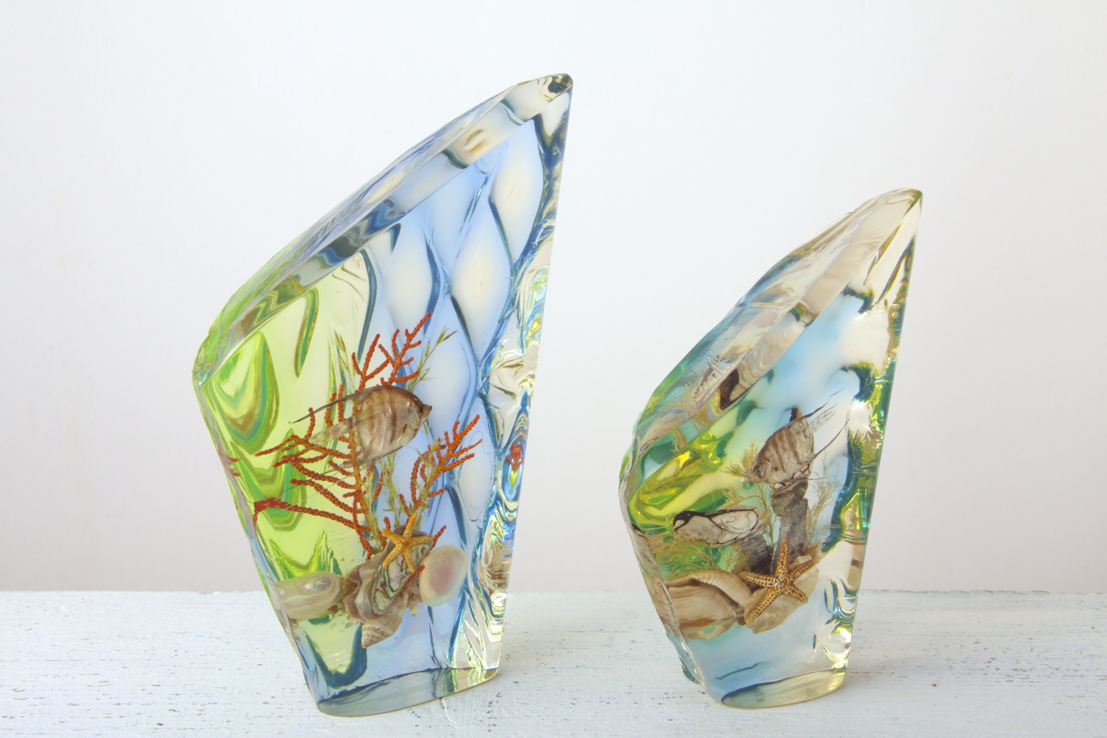 All encased in a blue / yellow / green colour resin block with the backs textured like rippled water, which catches the light beautifully and glows amazingly due to the form and colour.